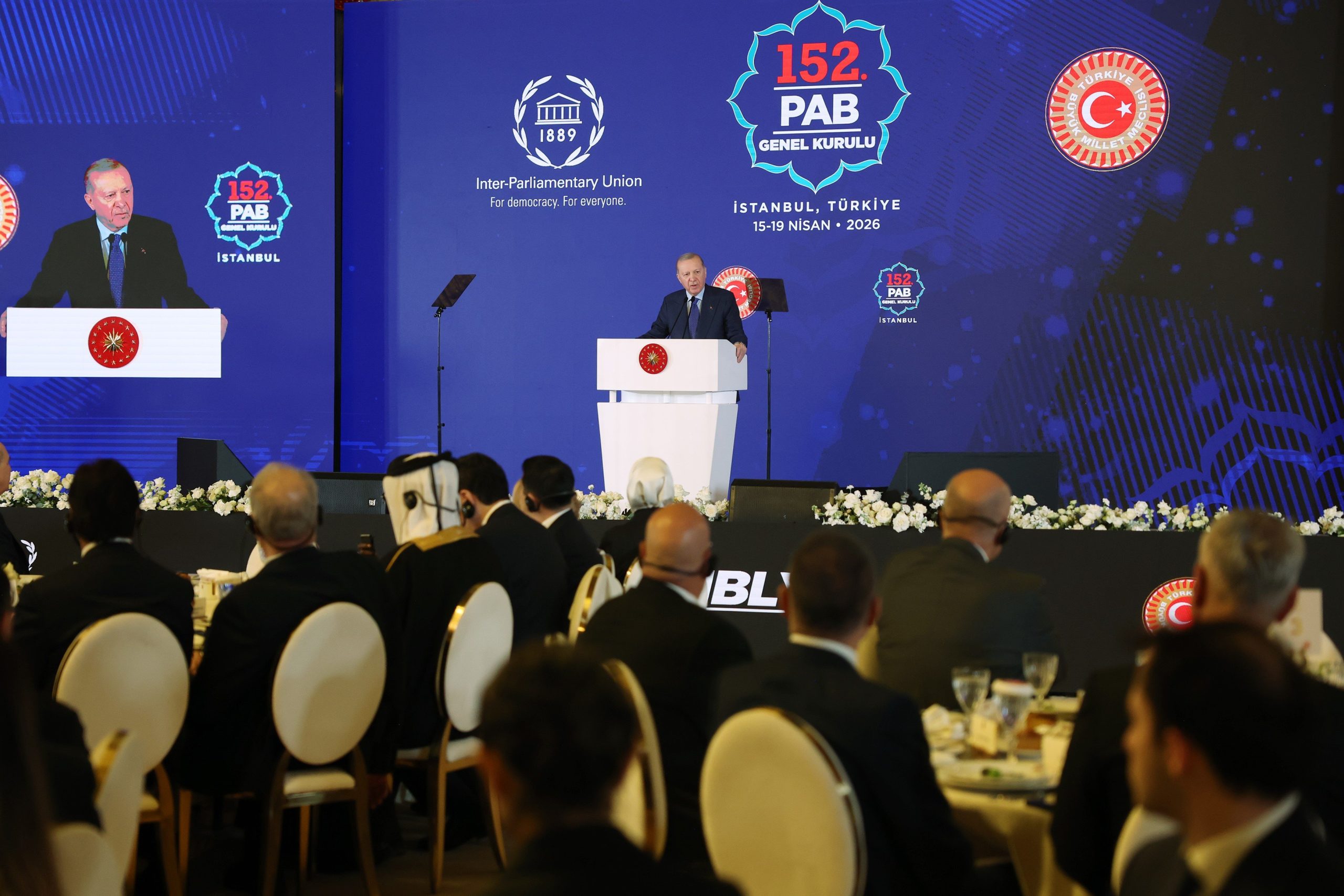 Cumhurbaşkanı Erdoğan, “Türkiye ve İstanbul olarak parlamentolar arası birliğin genel kuruluna 4. kez ev sahipliği yapmaktan duyduğumuz memnuniyeti sözlerimin hemen başında ifade etmek istiyorum. Gelecek nesiller için umudu yeşertmek, barışı sağlamak ve adaleti temin etmek temasıyla toplanan 152. Genel Kurulun tüm insanlık için hayırlara vesile olmasını diliyorum. Genel Kurul kapsamında alınacak kararların, yapılacak tartışmaların, buradaki tespit, tenkit ve tekliflerin, aynı şekilde icra edilecek komite toplantıları, forum oturumları ve yan etkinliklerin aramızdaki dostluk ve dayanışmayı daha da güçlendirmesini, Gazze’deki mezalim başta olmak üzere mevcut sorunların çözümüne katkı vermesini temenni ediyorum. 2026’nın ilk genel kuruluna başarıyla ev sahipliği yapan Türkiye Büyük Millet Meclisimizi, Sayın Meclis Başkanımızı ve milletvekillerimizi ayrıca tebrik ediyorum. Son olarak Genel Sekreterlik görevini 12 yıldır başarıyla yürüten Sayın Martin Chungong’a Birliğe yaptığı katkılar için teşekkür ediyor, bu önemli vazifeyi devralacak arkadaşımıza muvaffakiyetler diliyorum. Parlamentolar Arası Birlik Toplantısı tam 137 yıldır çok önemli bir işlevi yerine getiriyor. ‘Herkes İçin Demokrasi’ anlayışıyla parlamenter demokrasiye açılan Birliğin siz kıymetli mensuplarına bu akşam bir kez daha teşekkür ediyorum” dedi.